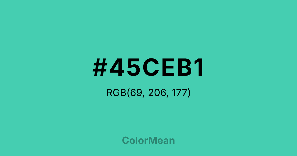 #45CEB1 RGB value is (69, 206, 177). The hex color red value is 69, green is 206, and blue is 177. Its HSL format shows a hue of 167°, saturation of 58 percent, and lightness of 54 percent. The CMYK process values are 67 percent, 0 percent, 14 percent, 19 percent.