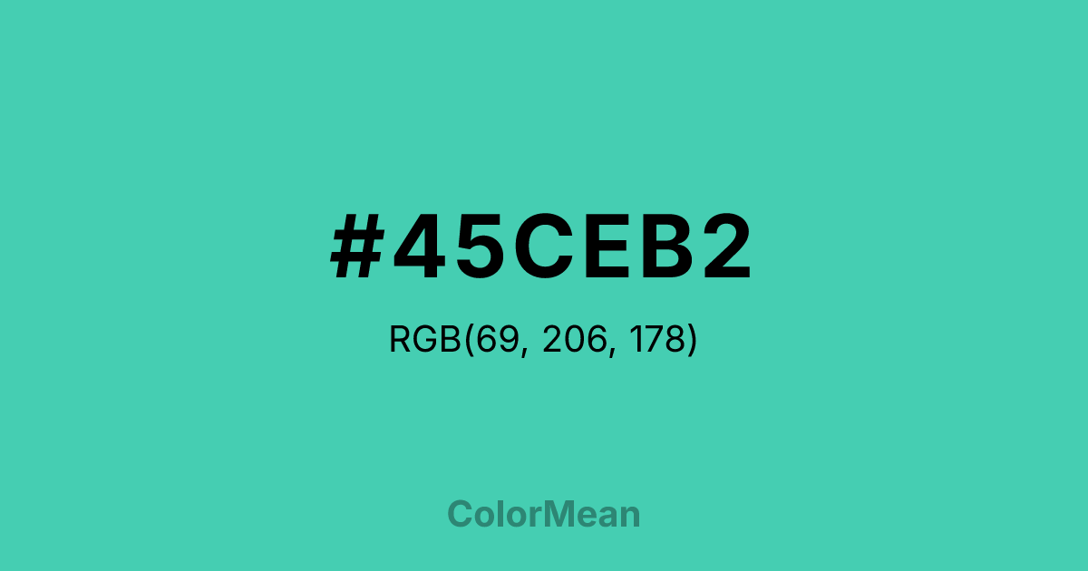 #45CEB2 RGB value is (69, 206, 178). The hex color red value is 69, green is 206, and blue is 178. Its HSL format shows a hue of 168°, saturation of 58 percent, and lightness of 54 percent. The CMYK process values are 67 percent, 0 percent, 14 percent, 19 percent.