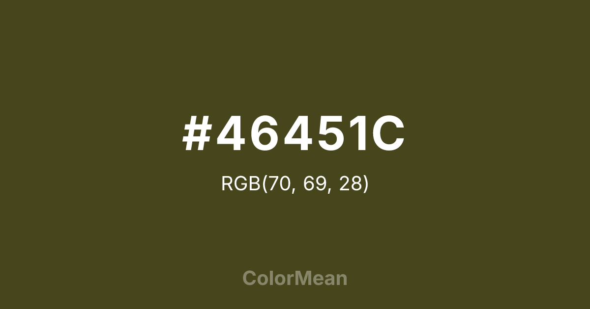 #46451C RGB value is (70, 69, 28). The hex color red value is 70, green is 69, and blue is 28. Its HSL format shows a hue of 59°, saturation of 43 percent, and lightness of 19 percent. The CMYK process values are 0 percent, 1 percent, 60 percent, 73 percent.