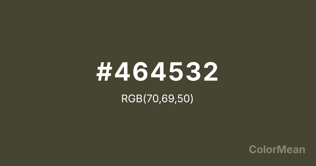 #464532 RGB value is (70, 69, 50). The hex color red value is 70, green is 69, and blue is 50. Its HSL format shows a hue of 57°, saturation of 17 percent, and lightness of 24 percent. The CMYK process values are 0 percent, 1 percent, 29 percent, 73 percent.