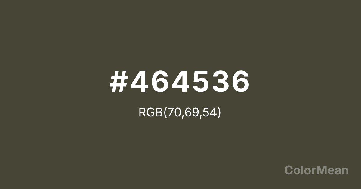 #464536 RGB value is (70, 69, 54). The hex color red value is 70, green is 69, and blue is 54. Its HSL format shows a hue of 56°, saturation of 13 percent, and lightness of 24 percent. The CMYK process values are 0 percent, 1 percent, 23 percent, 73 percent.