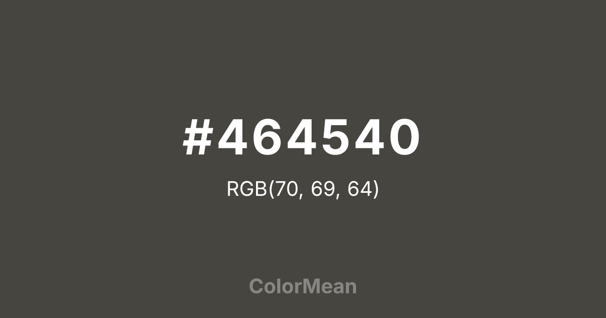 #464540 RGB value is (70, 69, 64). The hex color red value is 70, green is 69, and blue is 64. Its HSL format shows a hue of 50°, saturation of 4 percent, and lightness of 26 percent. The CMYK process values are 0 percent, 1 percent, 9 percent, 73 percent.