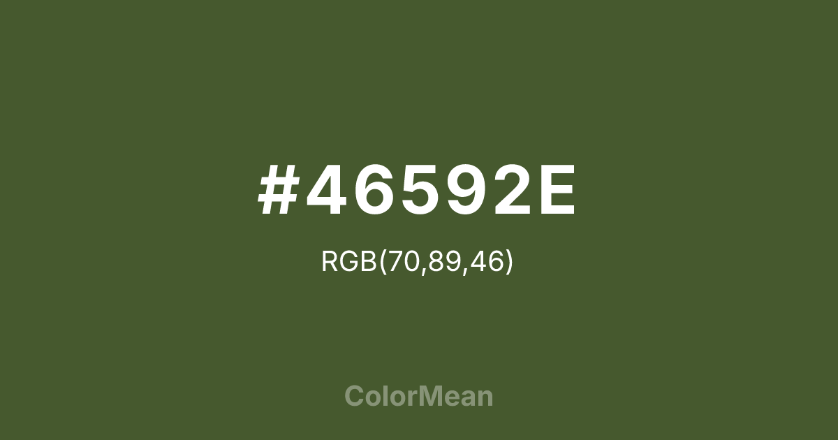 #46592E RGB value is (70, 89, 46). The hex color red value is 70, green is 89, and blue is 46. Its HSL format shows a hue of 87°, saturation of 32 percent, and lightness of 26 percent. The CMYK process values are 21 percent, 0 percent, 48 percent, 65 percent.