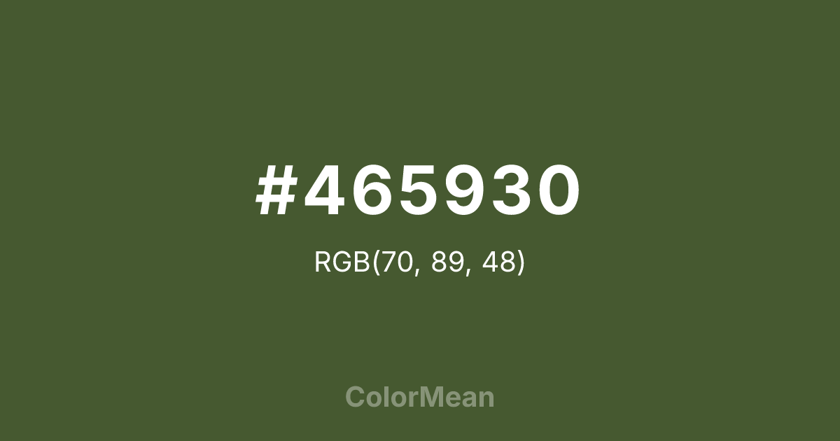 #465930 RGB value is (70, 89, 48). The hex color red value is 70, green is 89, and blue is 48. Its HSL format shows a hue of 88°, saturation of 30 percent, and lightness of 27 percent. The CMYK process values are 21 percent, 0 percent, 46 percent, 65 percent.