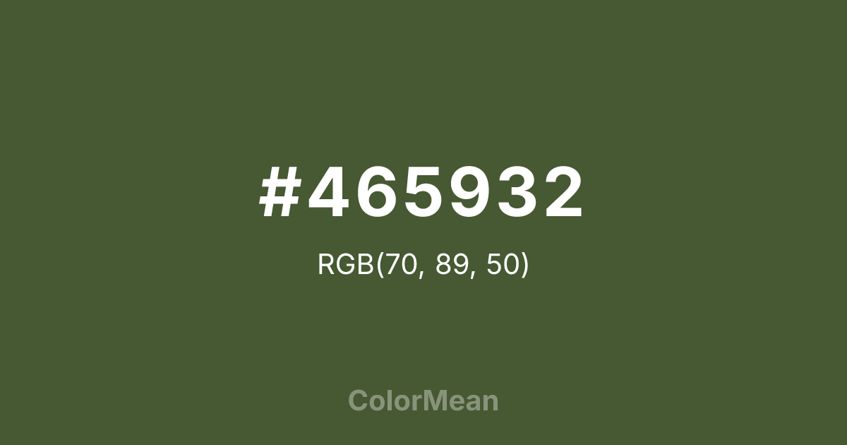 #465932 RGB value is (70, 89, 50). The hex color red value is 70, green is 89, and blue is 50. Its HSL format shows a hue of 89°, saturation of 28 percent, and lightness of 27 percent. The CMYK process values are 21 percent, 0 percent, 44 percent, 65 percent.