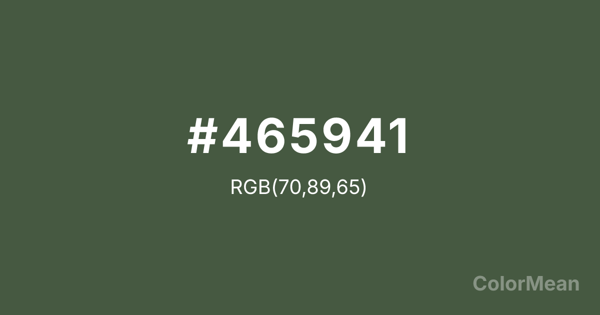 #465941 RGB value is (70, 89, 65). The hex color red value is 70, green is 89, and blue is 65. Its HSL format shows a hue of 107°, saturation of 16 percent, and lightness of 30 percent. The CMYK process values are 21 percent, 0 percent, 27 percent, 65 percent.