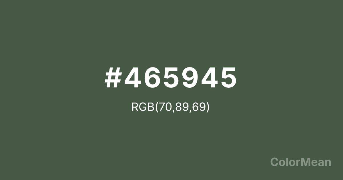 Gray Asparagus (#465945) RGB value is (70, 89, 69). The hex color red value is 70, green is 89, and blue is 69. Its HSL format shows a hue of 117°, saturation of 13 percent, and lightness of 31 percent. The CMYK process values are 21 percent, 0 percent, 22 percent, 65 percent.