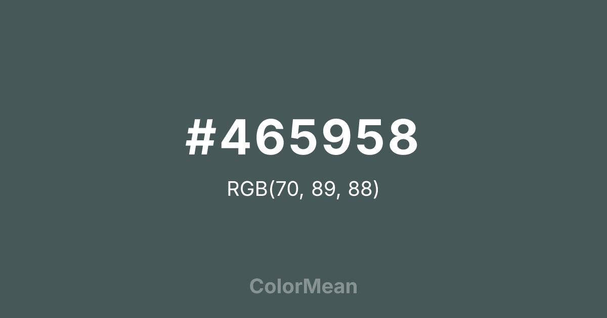 #465958 RGB value is (70, 89, 88). The hex color red value is 70, green is 89, and blue is 88. Its HSL format shows a hue of 177°, saturation of 12 percent, and lightness of 31 percent. The CMYK process values are 21 percent, 0 percent, 1 percent, 65 percent.