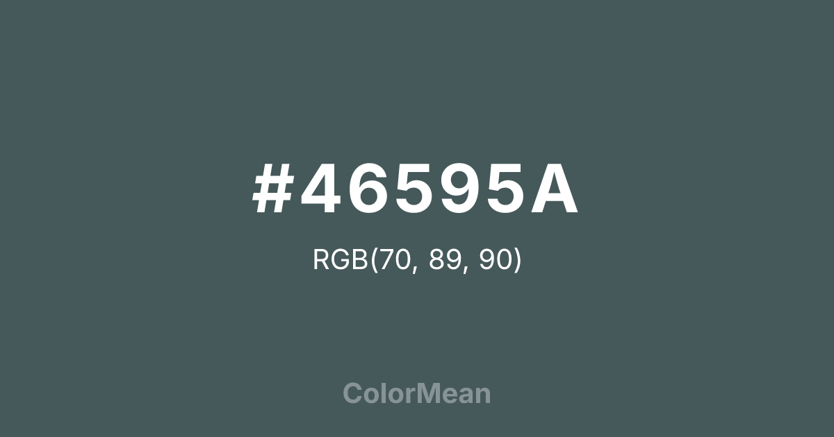 #46595A RGB value is (70, 89, 90). The hex color red value is 70, green is 89, and blue is 90. Its HSL format shows a hue of 183°, saturation of 13 percent, and lightness of 31 percent. The CMYK process values are 22 percent, 1 percent, 0 percent, 65 percent.