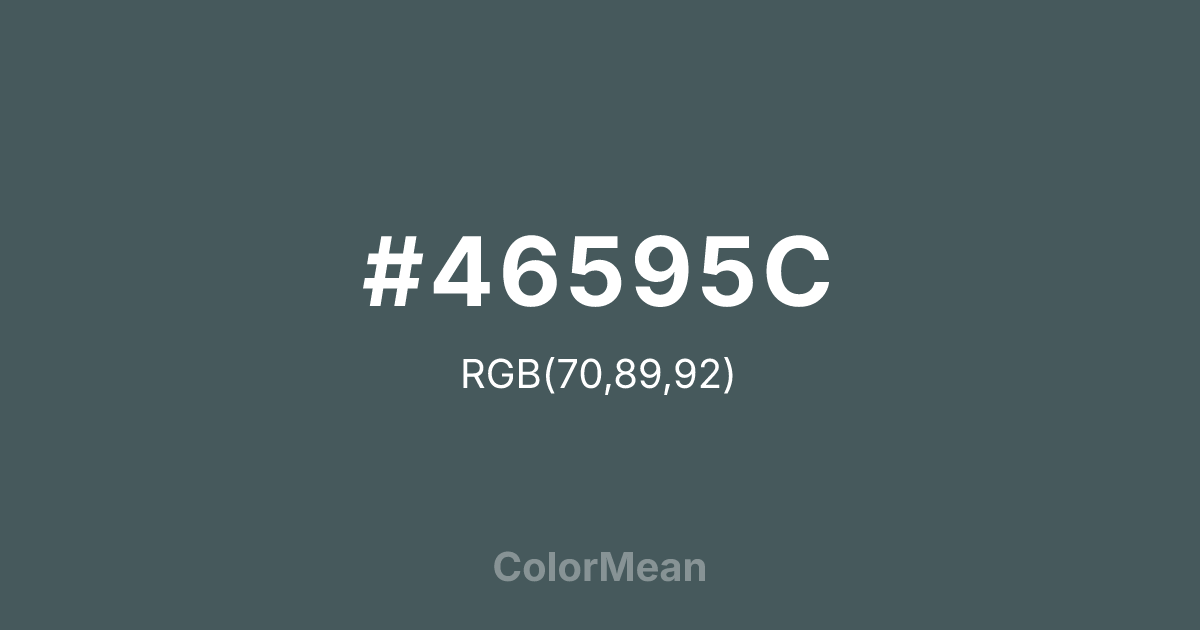 #46595C RGB value is (70, 89, 92). The hex color red value is 70, green is 89, and blue is 92. Its HSL format shows a hue of 188°, saturation of 14 percent, and lightness of 32 percent. The CMYK process values are 24 percent, 3 percent, 0 percent, 64 percent.