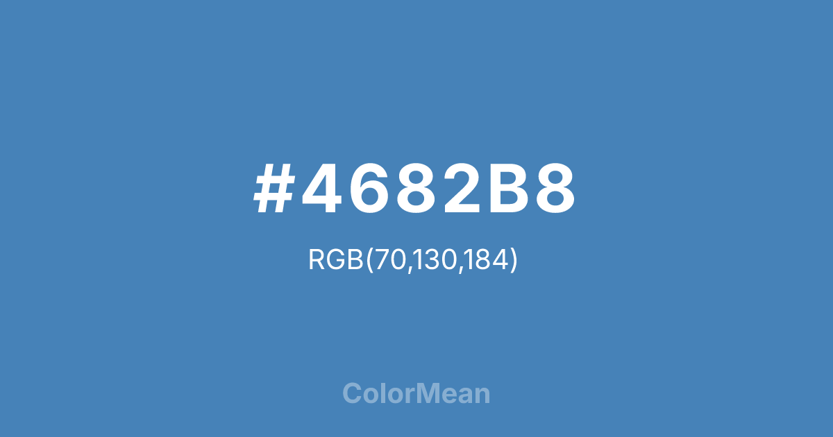 #4682B8 RGB value is (70, 130, 184). The hex color red value is 70, green is 130, and blue is 184. Its HSL format shows a hue of 208°, saturation of 45 percent, and lightness of 50 percent. The CMYK process values are 62 percent, 29 percent, 0 percent, 28 percent.