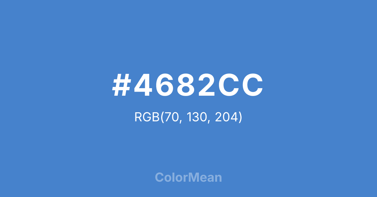 #4682CC RGB value is (70, 130, 204). The hex color red value is 70, green is 130, and blue is 204. Its HSL format shows a hue of 213°, saturation of 57 percent, and lightness of 54 percent. The CMYK process values are 66 percent, 36 percent, 0 percent, 20 percent.