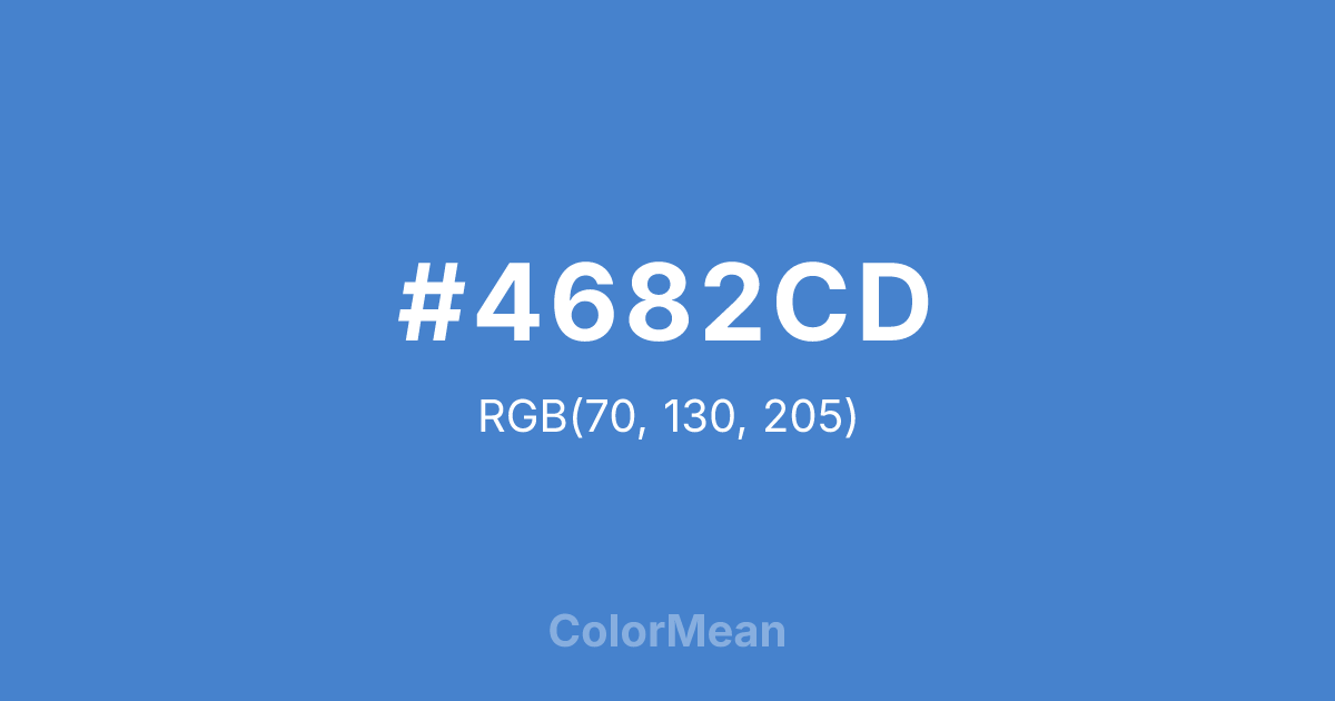 #4682CD RGB value is (70, 130, 205). The hex color red value is 70, green is 130, and blue is 205. Its HSL format shows a hue of 213°, saturation of 57 percent, and lightness of 54 percent. The CMYK process values are 66 percent, 37 percent, 0 percent, 20 percent.