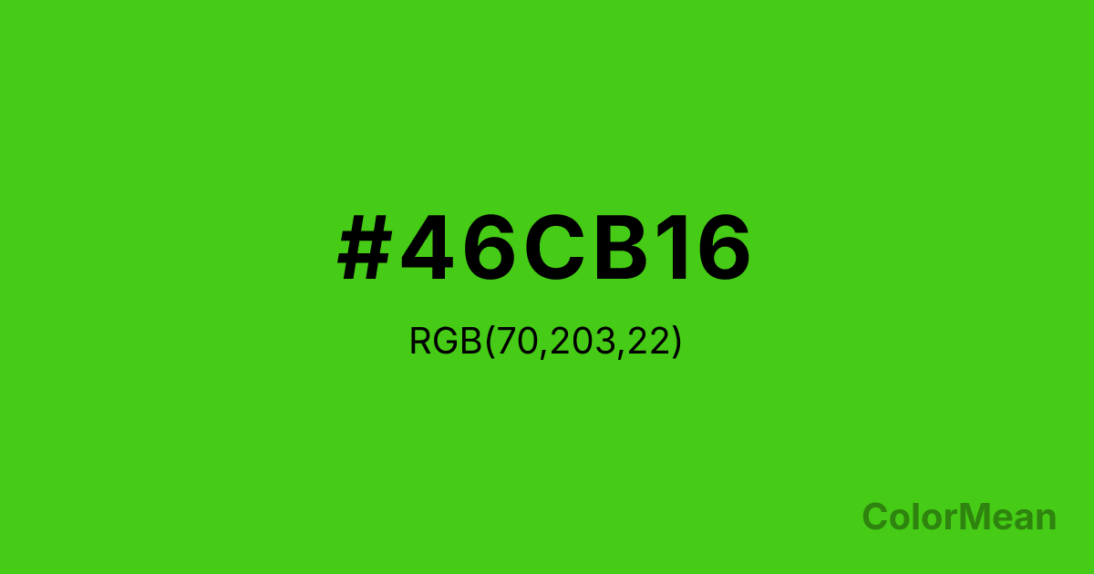 #46CB16 RGB value is (70, 203, 22). The hex color red value is 70, green is 203, and blue is 22. Its HSL format shows a hue of 104°, saturation of 80 percent, and lightness of 44 percent. The CMYK process values are 66 percent, 0 percent, 89 percent, 20 percent.