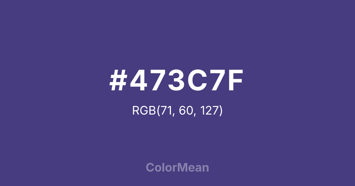 #473C7F RGB value is (71, 60, 127). The hex color red value is 71, green is 60, and blue is 127. Its HSL format shows a hue of 250°, saturation of 36 percent, and lightness of 37 percent. The CMYK process values are 44 percent, 53 percent, 0 percent, 50 percent.
