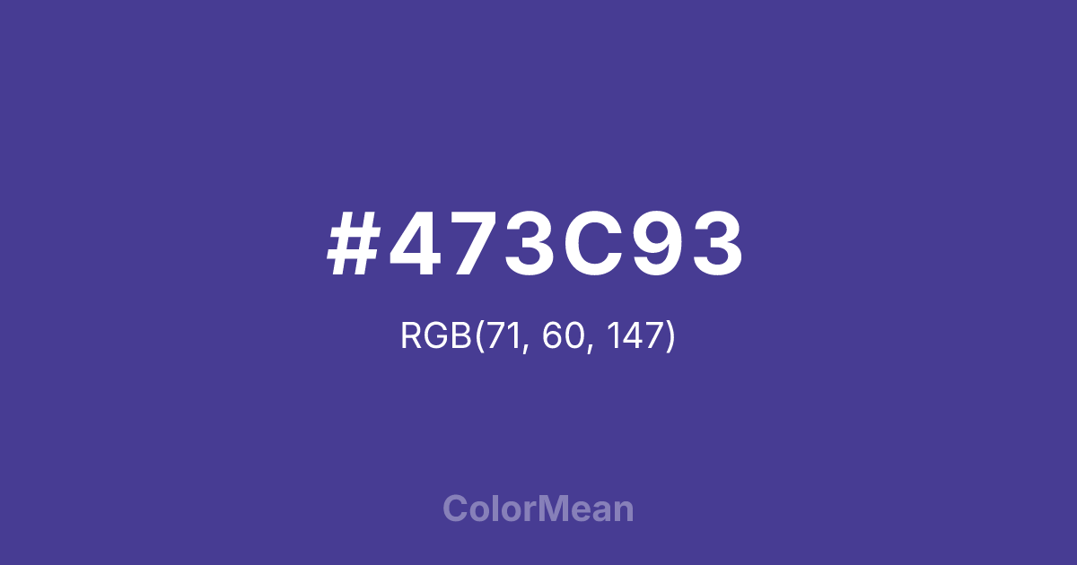 #473C93 RGB value is (71, 60, 147). The hex color red value is 71, green is 60, and blue is 147. Its HSL format shows a hue of 248°, saturation of 42 percent, and lightness of 41 percent. The CMYK process values are 52 percent, 59 percent, 0 percent, 42 percent.