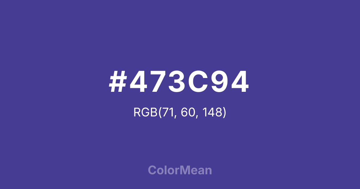 #473C94 RGB value is (71, 60, 148). The hex color red value is 71, green is 60, and blue is 148. Its HSL format shows a hue of 248°, saturation of 42 percent, and lightness of 41 percent. The CMYK process values are 52 percent, 59 percent, 0 percent, 42 percent.