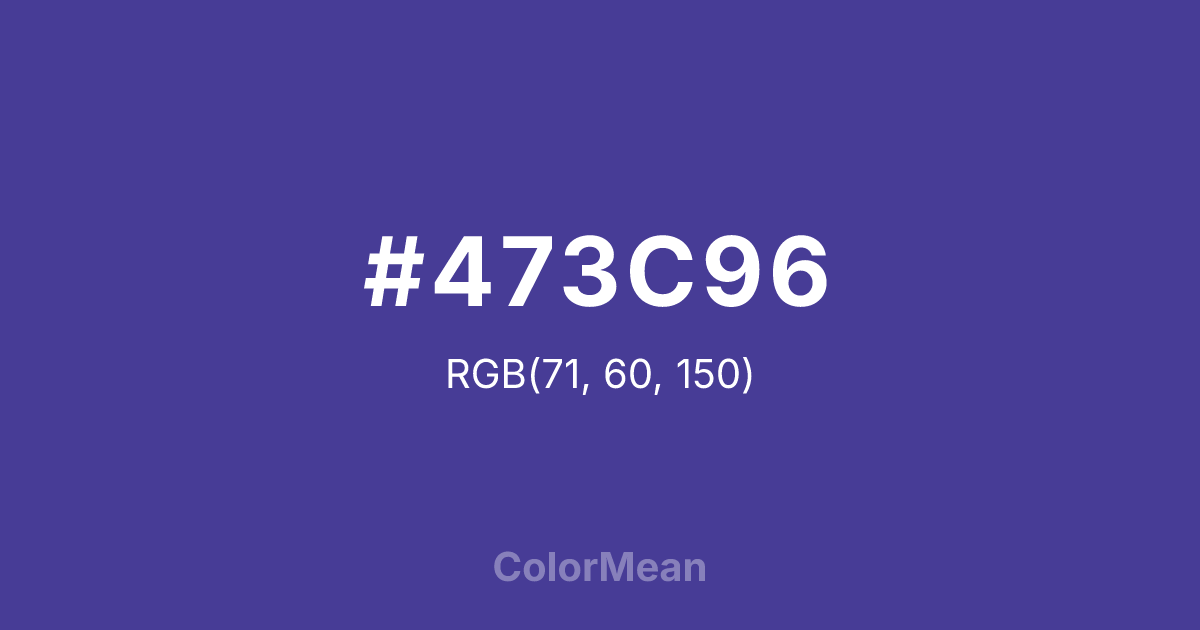 #473C96 RGB value is (71, 60, 150). The hex color red value is 71, green is 60, and blue is 150. Its HSL format shows a hue of 247°, saturation of 43 percent, and lightness of 41 percent. The CMYK process values are 53 percent, 60 percent, 0 percent, 41 percent.