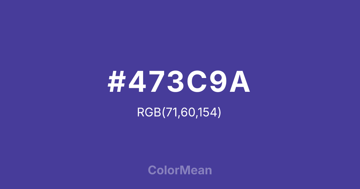 #473C9A RGB value is (71, 60, 154). The hex color red value is 71, green is 60, and blue is 154. Its HSL format shows a hue of 247°, saturation of 44 percent, and lightness of 42 percent. The CMYK process values are 54 percent, 61 percent, 0 percent, 40 percent.