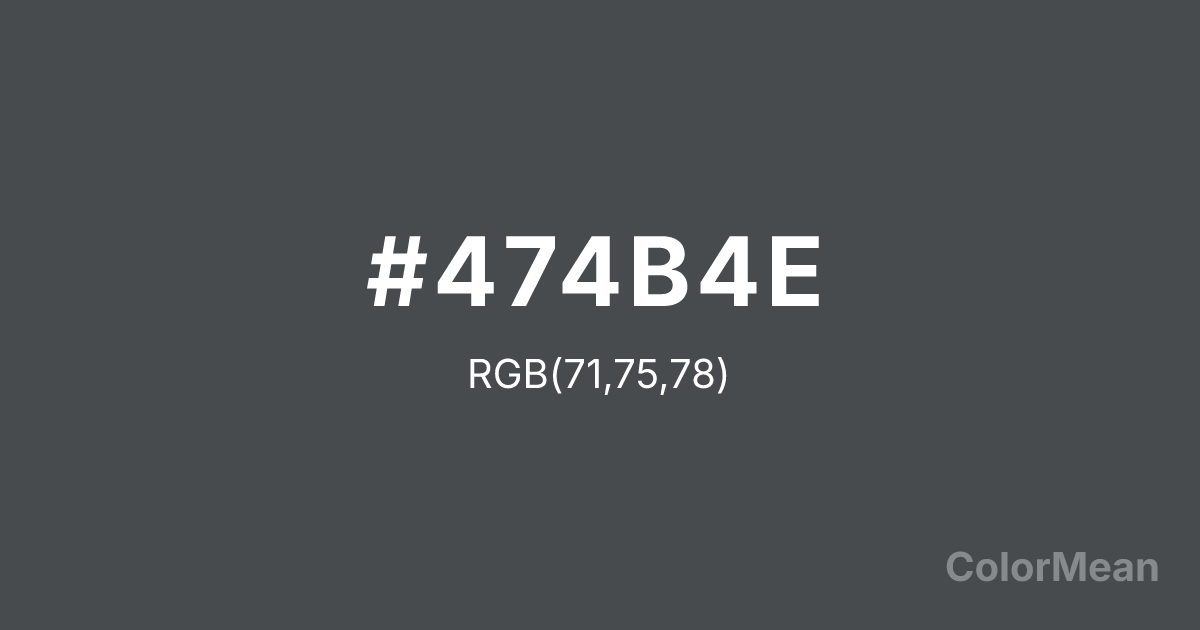 Blue Grey (#474B4E) RGB value is (71, 75, 78). The hex color red value is 71, green is 75, and blue is 78. Its HSL format shows a hue of 206°, saturation of 5 percent, and lightness of 29 percent. The CMYK process values are 9 percent, 4 percent, 0 percent, 69 percent.