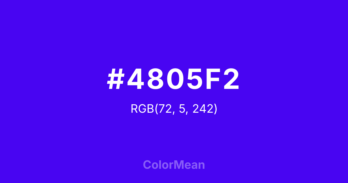 #4805F2 RGB value is (72, 5, 242). The hex color red value is 72, green is 5, and blue is 242. Its HSL format shows a hue of 257°, saturation of 96 percent, and lightness of 48 percent. The CMYK process values are 70 percent, 98 percent, 0 percent, 5 percent.