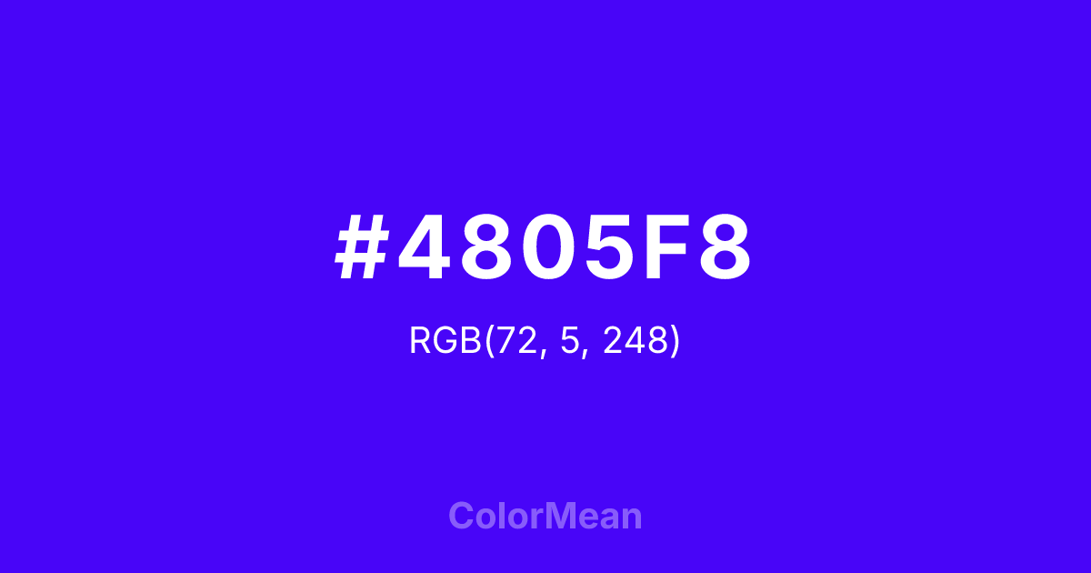 #4805F8 RGB value is (72, 5, 248). The hex color red value is 72, green is 5, and blue is 248. Its HSL format shows a hue of 257°, saturation of 96 percent, and lightness of 50 percent. The CMYK process values are 71 percent, 98 percent, 0 percent, 3 percent.