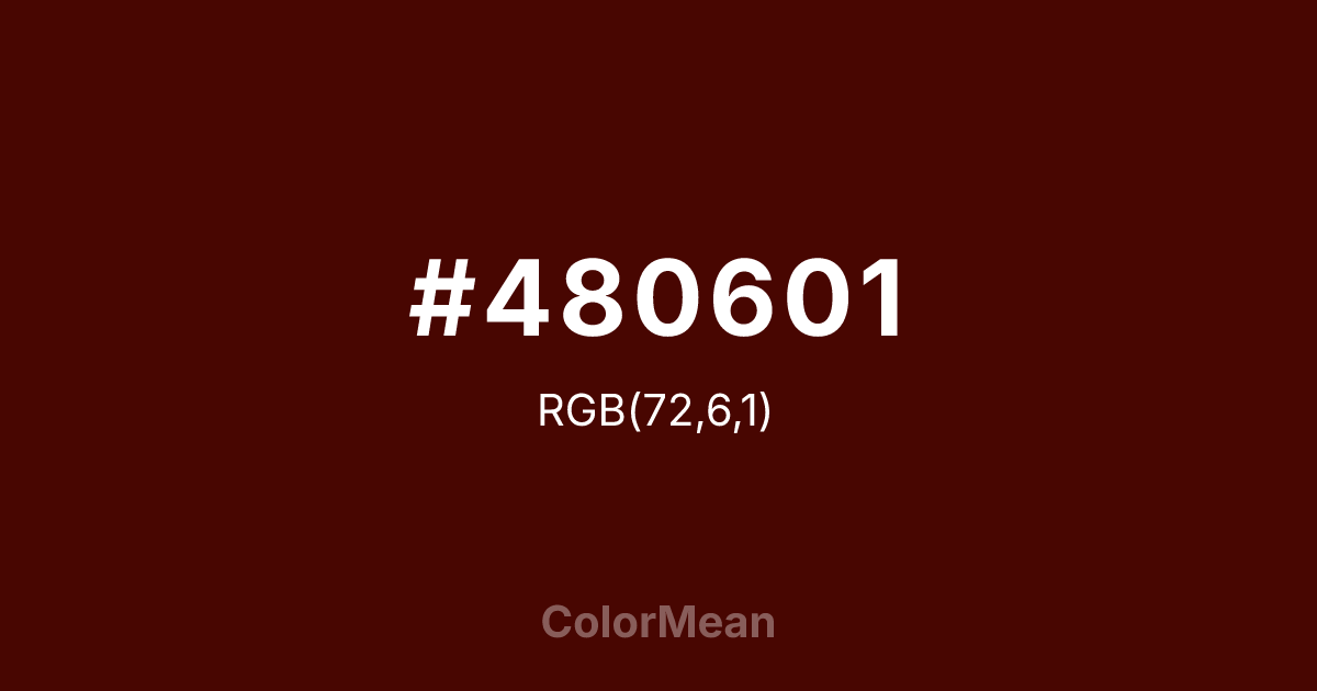 #480601 RGB value is (72, 6, 1). The hex color red value is 72, green is 6, and blue is 1. Its HSL format shows a hue of 4°, saturation of 97 percent, and lightness of 14 percent. The CMYK process values are 0 percent, 92 percent, 99 percent, 72 percent.