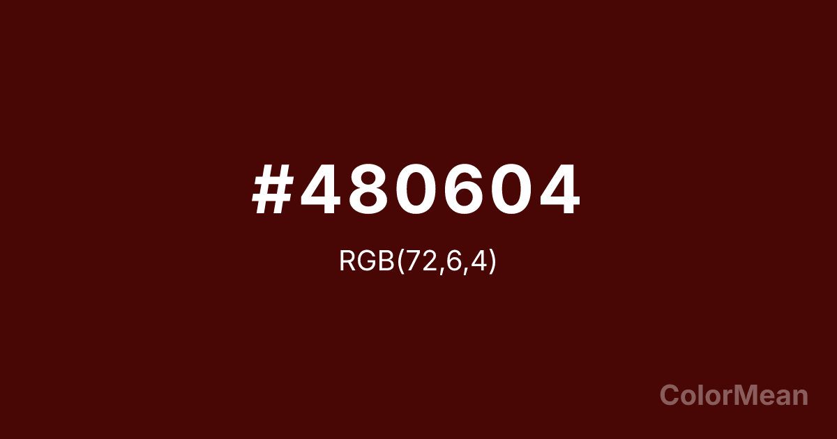 #480604 RGB value is (72, 6, 4). The hex color red value is 72, green is 6, and blue is 4. Its HSL format shows a hue of 2°, saturation of 89 percent, and lightness of 15 percent. The CMYK process values are 0 percent, 92 percent, 94 percent, 72 percent.