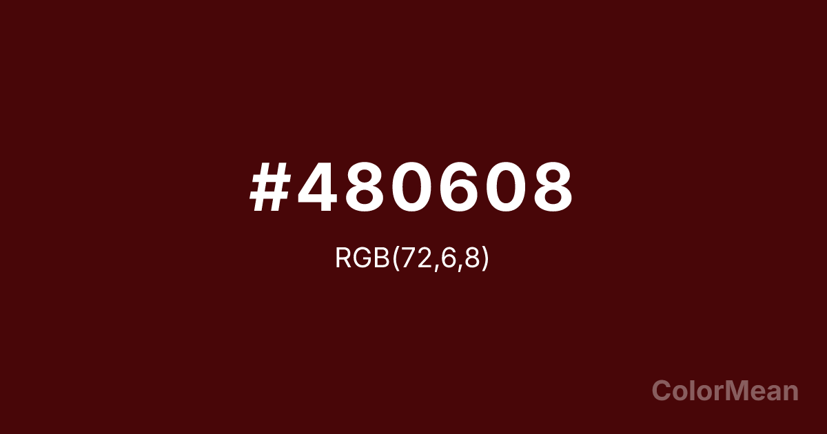 #480608 RGB value is (72, 6, 8). The hex color red value is 72, green is 6, and blue is 8. Its HSL format shows a hue of 358°, saturation of 85 percent, and lightness of 15 percent. The CMYK process values are 0 percent, 92 percent, 89 percent, 72 percent.