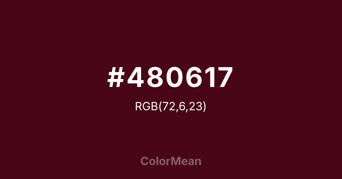 #480617 RGB value is (72, 6, 23). The hex color red value is 72, green is 6, and blue is 23. Its HSL format shows a hue of 345°, saturation of 85 percent, and lightness of 15 percent. The CMYK process values are 0 percent, 92 percent, 68 percent, 72 percent.