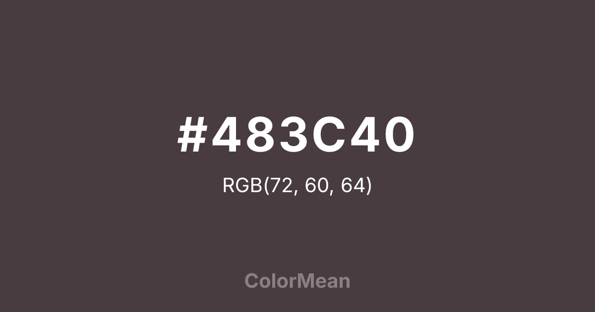 #483C40 RGB value is (72, 60, 64). The hex color red value is 72, green is 60, and blue is 64. Its HSL format shows a hue of 340°, saturation of 9 percent, and lightness of 26 percent. The CMYK process values are 0 percent, 17 percent, 11 percent, 72 percent.
