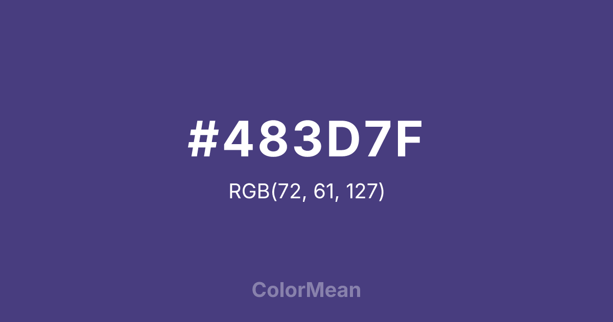 #483D7F RGB value is (72, 61, 127). The hex color red value is 72, green is 61, and blue is 127. Its HSL format shows a hue of 250°, saturation of 35 percent, and lightness of 37 percent. The CMYK process values are 43 percent, 52 percent, 0 percent, 50 percent.