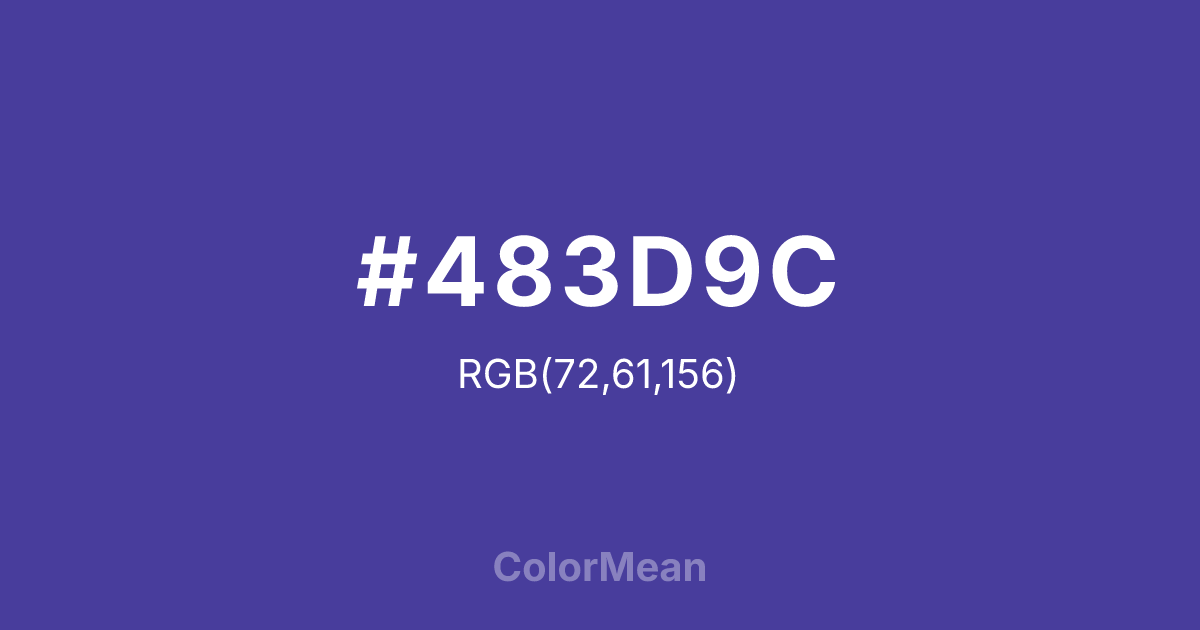 #483D9C RGB value is (72, 61, 156). The hex color red value is 72, green is 61, and blue is 156. Its HSL format shows a hue of 247°, saturation of 44 percent, and lightness of 43 percent. The CMYK process values are 54 percent, 61 percent, 0 percent, 39 percent.