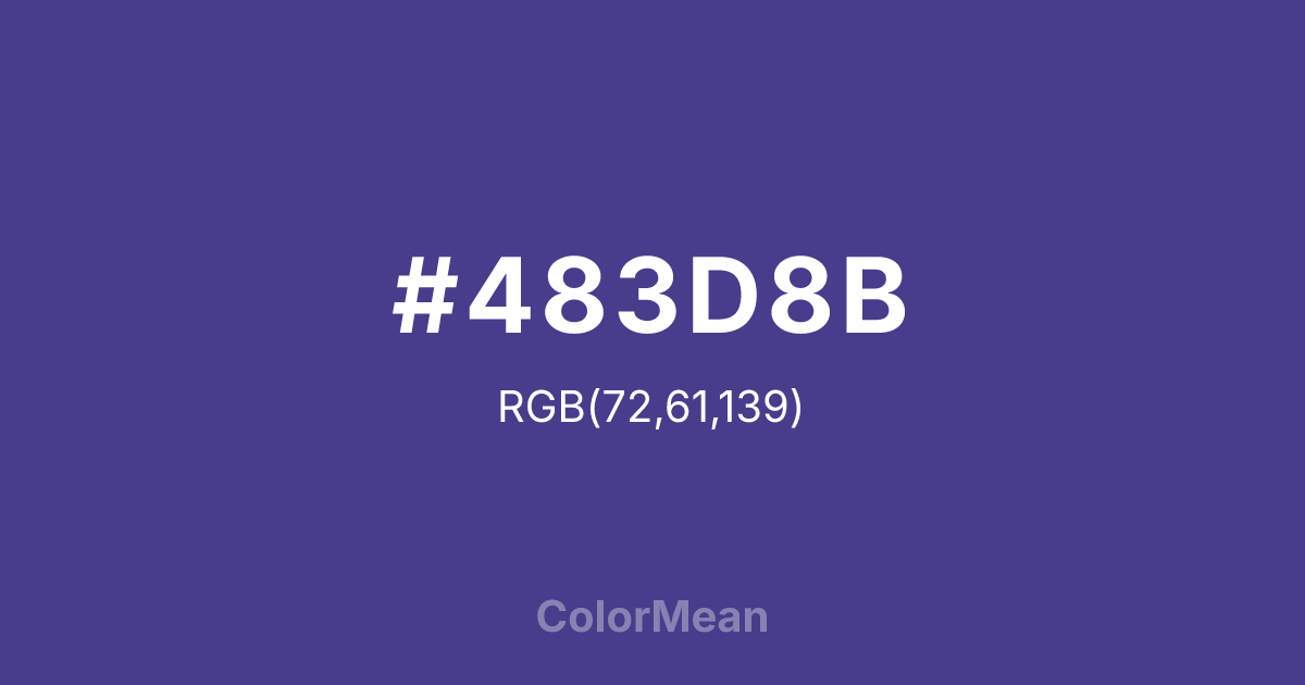 DarkslateBlue (#483D8B) RGB value is (72, 61, 139). The hex color red value is 72, green is 61, and blue is 139. Its HSL format shows a hue of 248°, saturation of 39 percent, and lightness of 39 percent. The CMYK process values are 48 percent, 56 percent, 0 percent, 45 percent.