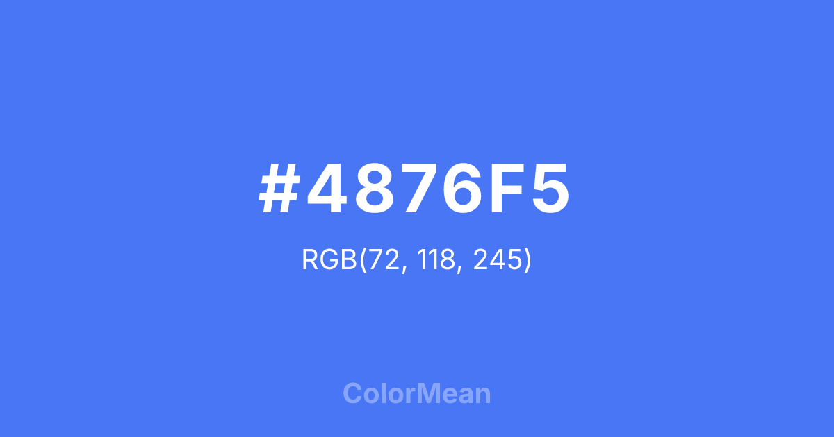 #4876F5 RGB value is (72, 118, 245). The hex color red value is 72, green is 118, and blue is 245. Its HSL format shows a hue of 224°, saturation of 90 percent, and lightness of 62 percent. The CMYK process values are 71 percent, 52 percent, 0 percent, 4 percent.