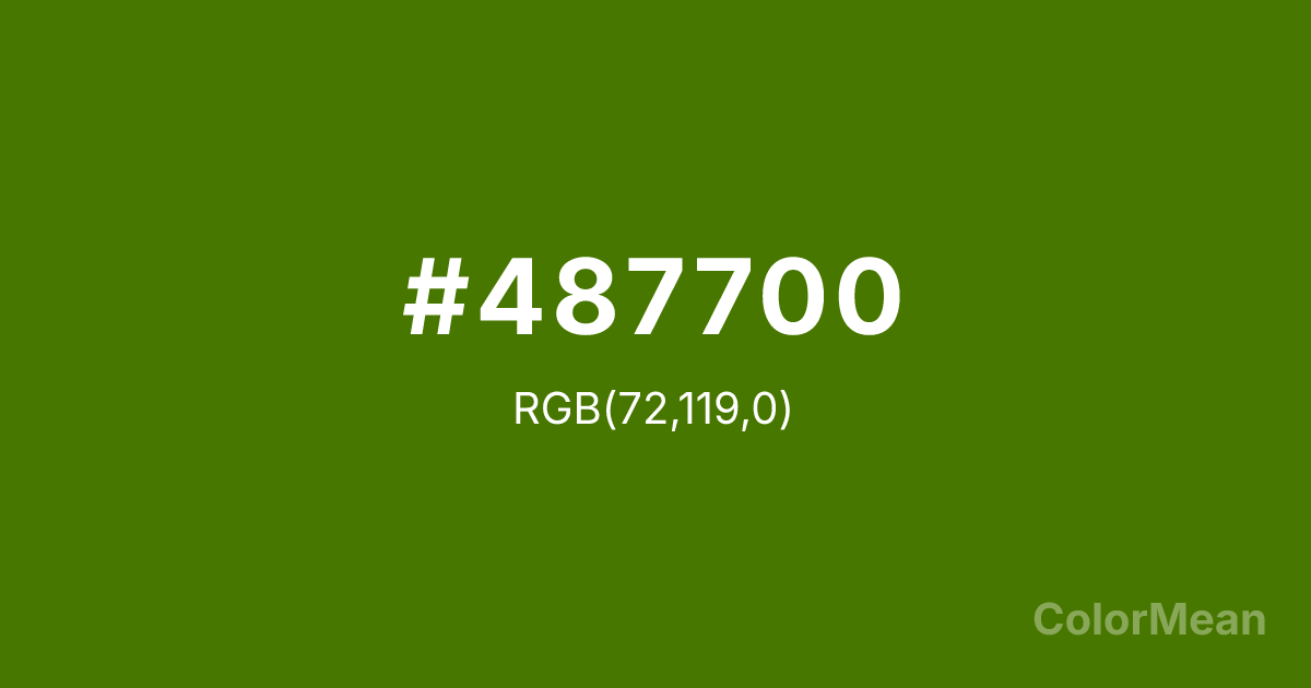 #487700 RGB value is (72, 119, 0). The hex color red value is 72, green is 119, and blue is 0. Its HSL format shows a hue of 84°, saturation of 100 percent, and lightness of 23 percent. The CMYK process values are 39 percent, 0 percent, 100 percent, 53 percent.