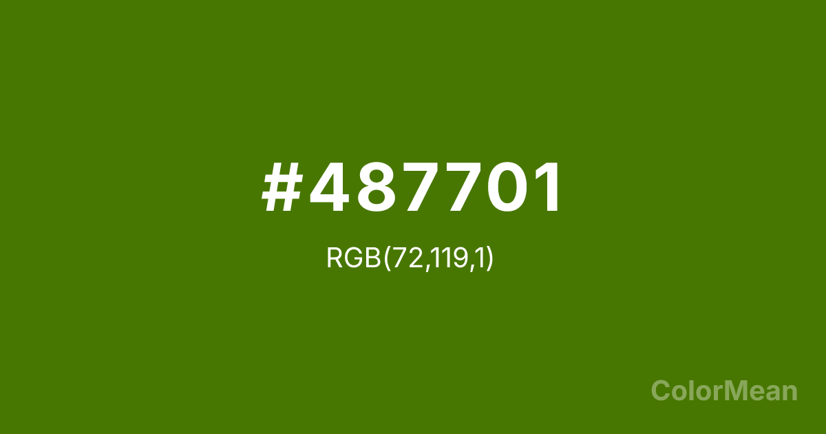 #487701 RGB value is (72, 119, 1). The hex color red value is 72, green is 119, and blue is 1. Its HSL format shows a hue of 84°, saturation of 98 percent, and lightness of 24 percent. The CMYK process values are 39 percent, 0 percent, 99 percent, 53 percent.