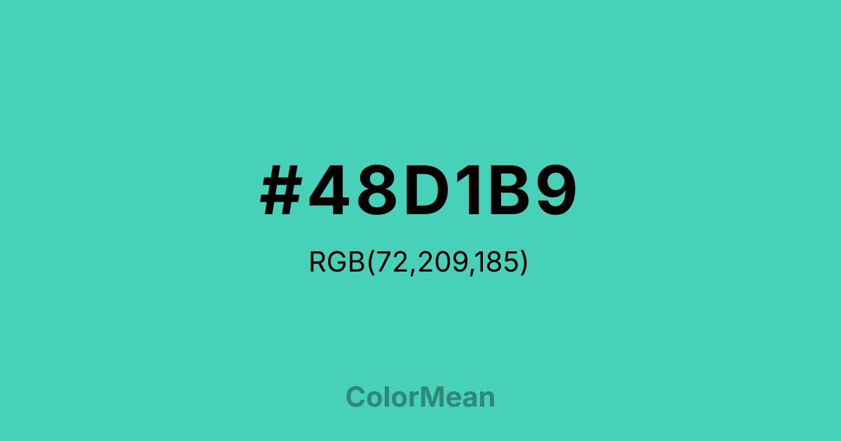 #48D1B9 RGB value is (72, 209, 185). The hex color red value is 72, green is 209, and blue is 185. Its HSL format shows a hue of 169°, saturation of 60 percent, and lightness of 55 percent. The CMYK process values are 66 percent, 0 percent, 11 percent, 18 percent.