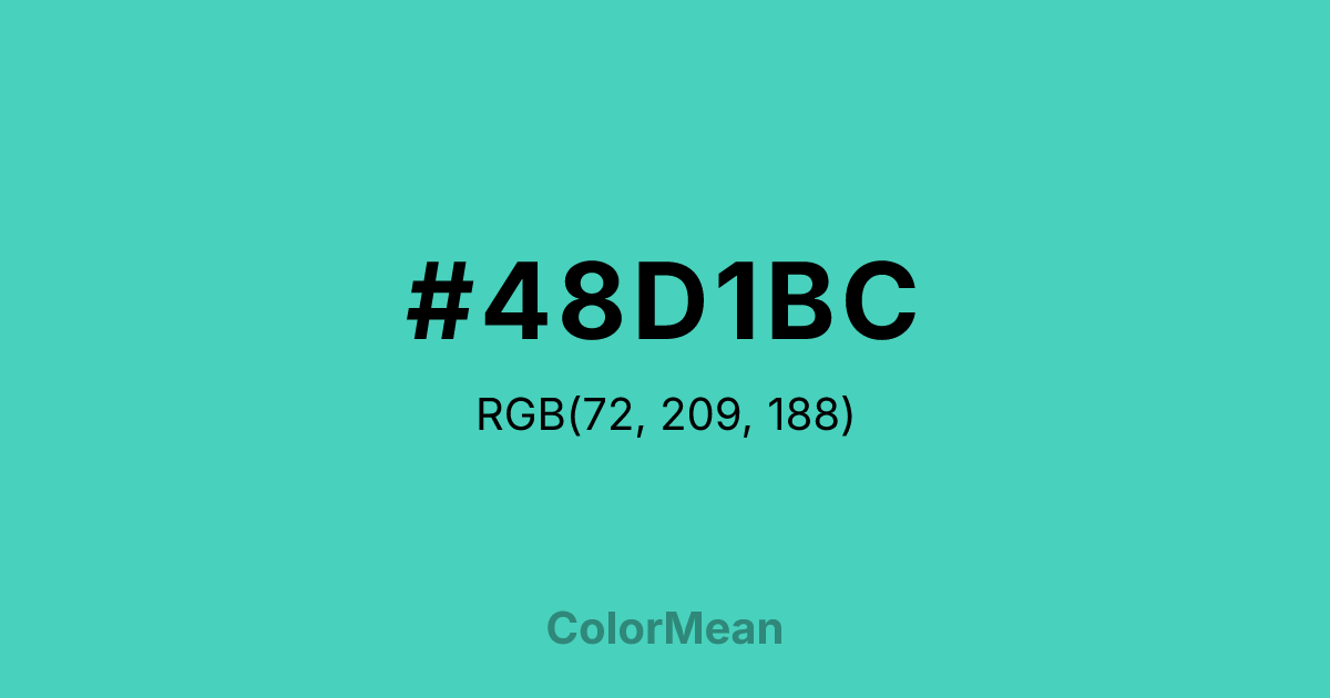 #48D1BC RGB value is (72, 209, 188). The hex color red value is 72, green is 209, and blue is 188. Its HSL format shows a hue of 171°, saturation of 60 percent, and lightness of 55 percent. The CMYK process values are 66 percent, 0 percent, 10 percent, 18 percent.