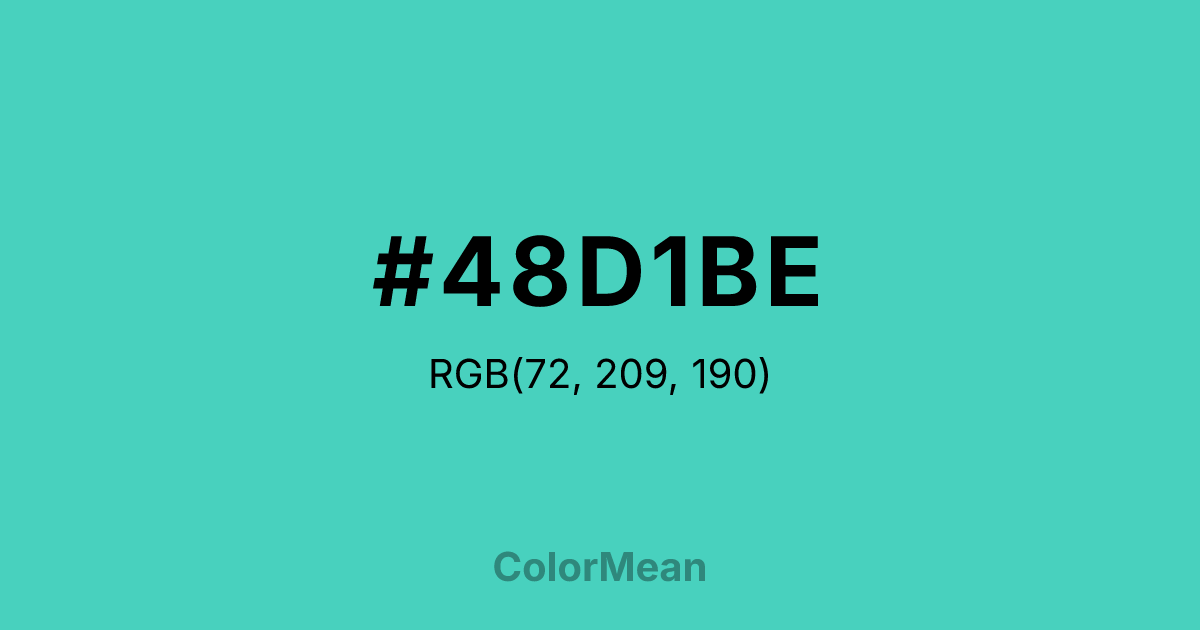 #48D1BE RGB value is (72, 209, 190). The hex color red value is 72, green is 209, and blue is 190. Its HSL format shows a hue of 172°, saturation of 60 percent, and lightness of 55 percent. The CMYK process values are 66 percent, 0 percent, 9 percent, 18 percent.