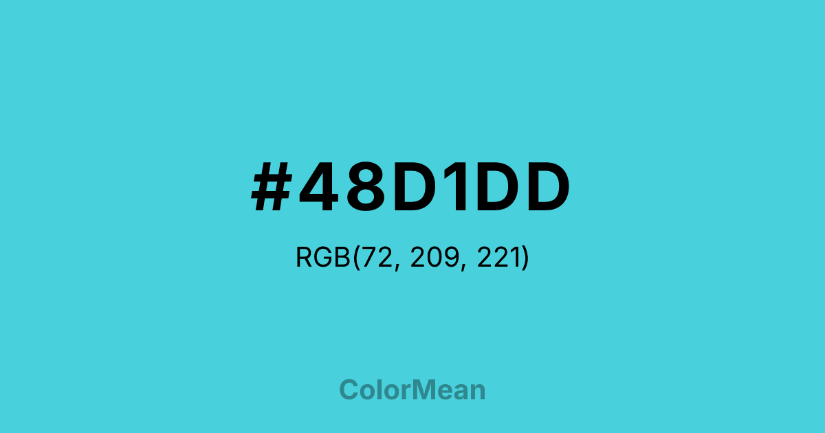#48D1DD RGB value is (72, 209, 221). The hex color red value is 72, green is 209, and blue is 221. Its HSL format shows a hue of 185°, saturation of 69 percent, and lightness of 57 percent. The CMYK process values are 67 percent, 5 percent, 0 percent, 13 percent.