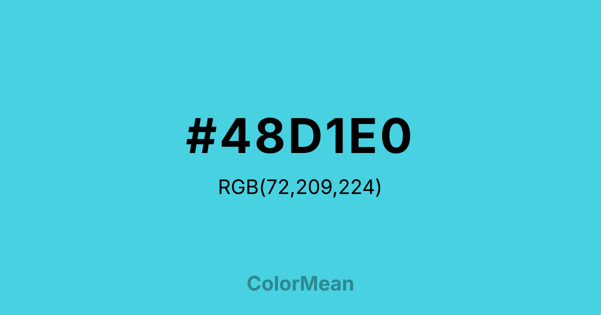 #48D1E0 RGB value is (72, 209, 224). The hex color red value is 72, green is 209, and blue is 224. Its HSL format shows a hue of 186°, saturation of 71 percent, and lightness of 58 percent. The CMYK process values are 68 percent, 7 percent, 0 percent, 12 percent.