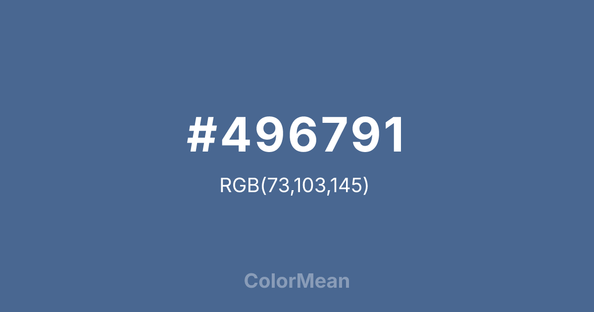 #496791 RGB value is (73, 103, 145). The hex color red value is 73, green is 103, and blue is 145. Its HSL format shows a hue of 215°, saturation of 33 percent, and lightness of 43 percent. The CMYK process values are 50 percent, 29 percent, 0 percent, 43 percent.
