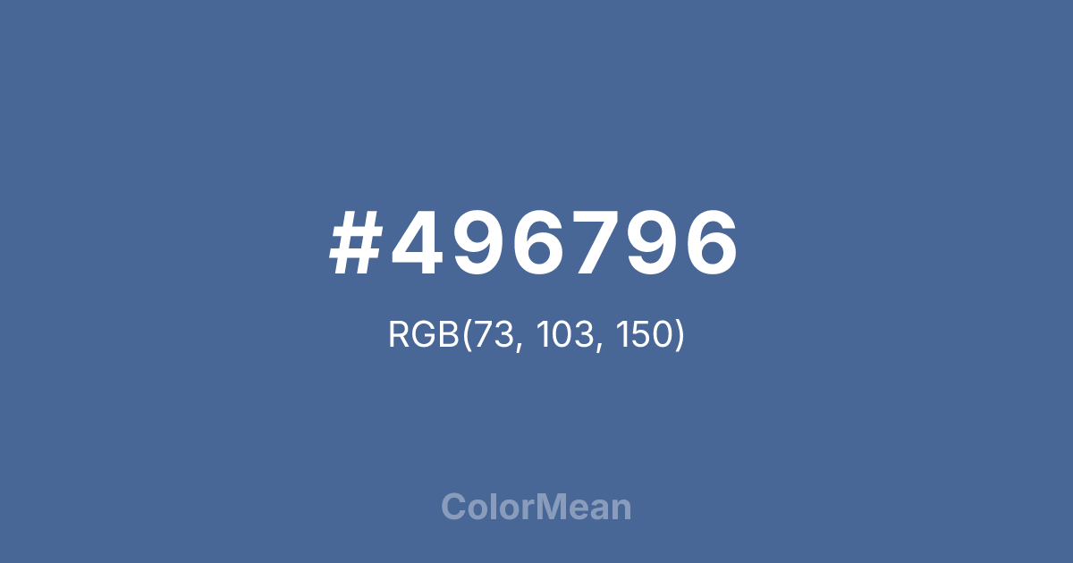 #496796 RGB value is (73, 103, 150). The hex color red value is 73, green is 103, and blue is 150. Its HSL format shows a hue of 217°, saturation of 35 percent, and lightness of 44 percent. The CMYK process values are 51 percent, 31 percent, 0 percent, 41 percent.