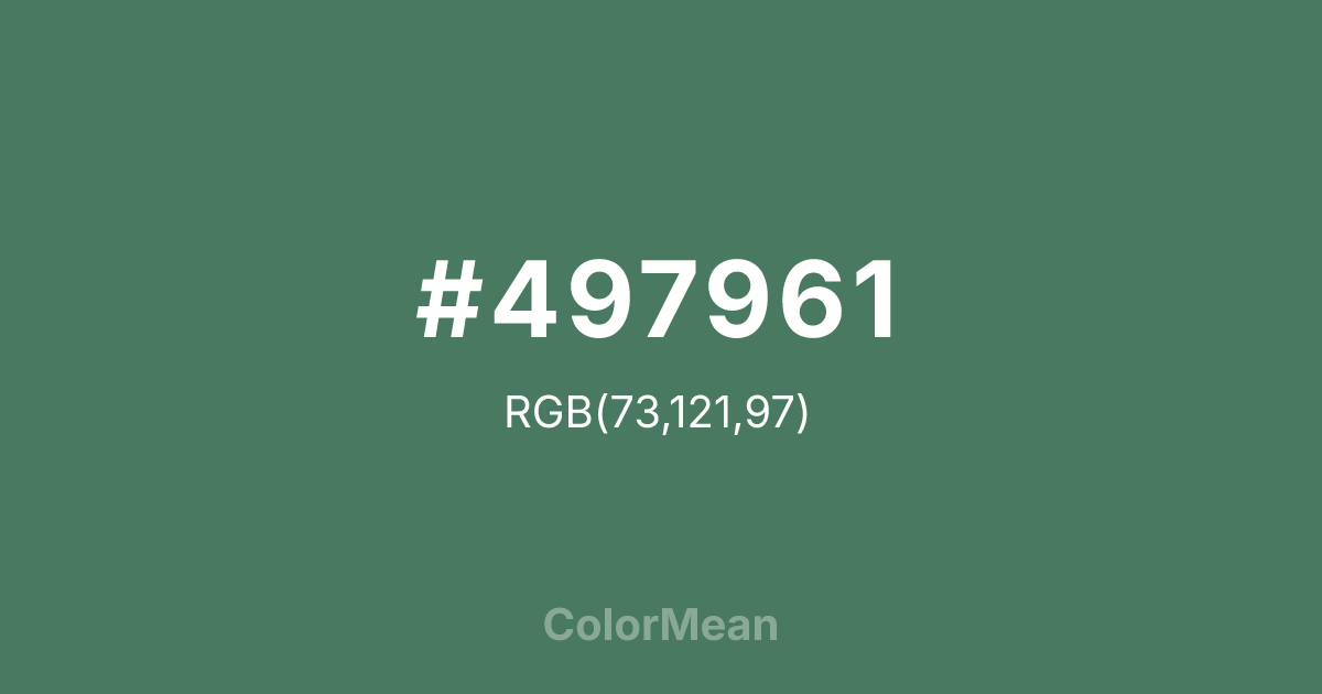 #497961 RGB value is (73, 121, 97). The hex color red value is 73, green is 121, and blue is 97. Its HSL format shows a hue of 150°, saturation of 25 percent, and lightness of 38 percent. The CMYK process values are 40 percent, 0 percent, 20 percent, 53 percent.