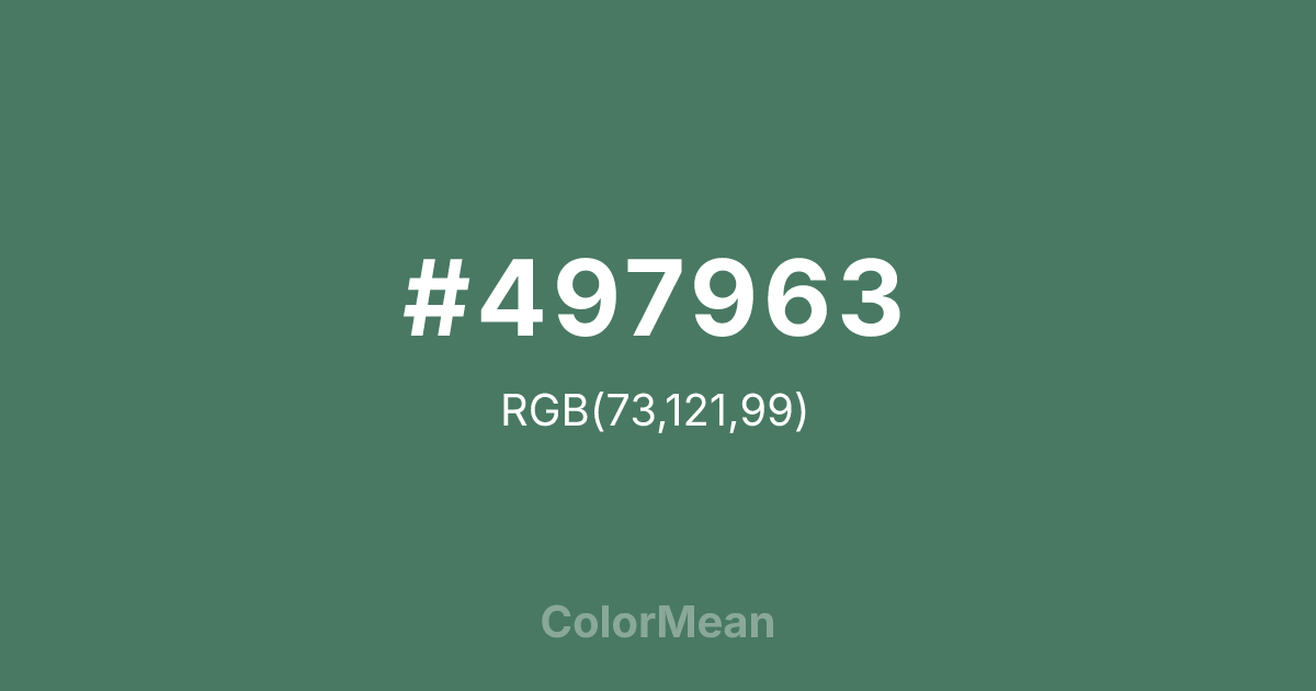 #497963 RGB value is (73, 121, 99). The hex color red value is 73, green is 121, and blue is 99. Its HSL format shows a hue of 153°, saturation of 25 percent, and lightness of 38 percent. The CMYK process values are 40 percent, 0 percent, 18 percent, 53 percent.