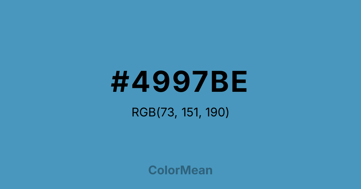 #4997BE RGB value is (73, 151, 190). The hex color red value is 73, green is 151, and blue is 190. Its HSL format shows a hue of 200°, saturation of 47 percent, and lightness of 52 percent. The CMYK process values are 62 percent, 21 percent, 0 percent, 25 percent.