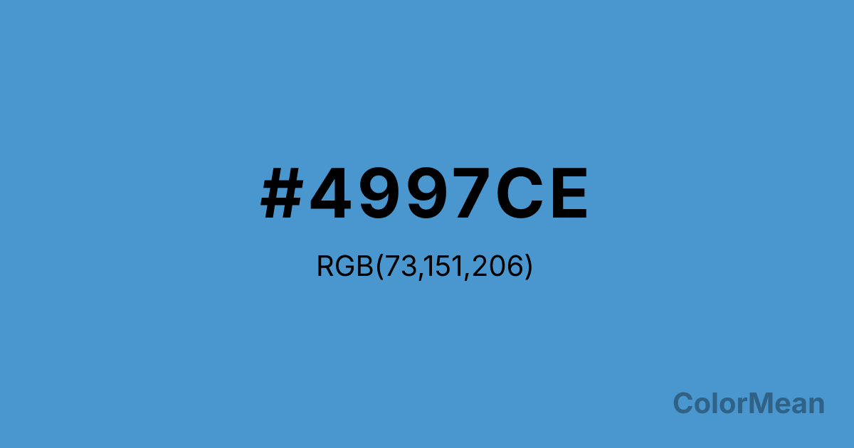 #4997CE RGB value is (73, 151, 206). The hex color red value is 73, green is 151, and blue is 206. Its HSL format shows a hue of 205°, saturation of 58 percent, and lightness of 55 percent. The CMYK process values are 65 percent, 27 percent, 0 percent, 19 percent.