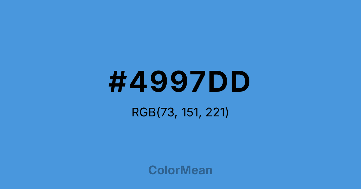 #4997DD RGB value is (73, 151, 221). The hex color red value is 73, green is 151, and blue is 221. Its HSL format shows a hue of 208°, saturation of 69 percent, and lightness of 58 percent. The CMYK process values are 67 percent, 32 percent, 0 percent, 13 percent.