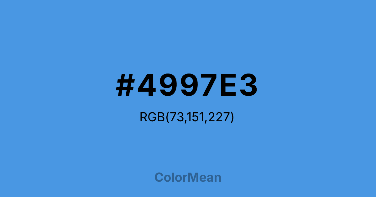 #4997E3 RGB value is (73, 151, 227). The hex color red value is 73, green is 151, and blue is 227. Its HSL format shows a hue of 210°, saturation of 73 percent, and lightness of 59 percent. The CMYK process values are 68 percent, 33 percent, 0 percent, 11 percent.